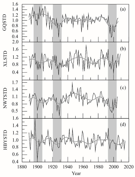 Comparisons of tree-ring records in the central Qinling Mountains (a) GQSTD [39], (b) XLSTD [40], (c) NWTSTD [41], and (d) HBYSTD (this study). The bold line represents the 20-year low pass data. The grey-shaded areas represent severe dry intervals discussed in text.