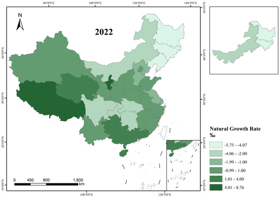 Figure 3 depicts the distribution of China’s natural population growth rate in 2022. Specifically, Heilongjiang Province showed a natural population growth rate of −5.75 per thousand, indicating that this province experiences negative population growth in its natural state. This can be mainly attributed to a decline in the birth rate, an increase in the death rate or a combination of the two. The natural population growth rate in Jilin Province was also negative—specifically −4.07‰—indicating that this area is also experiencing a population decline and is in urgent need of effective measures to stimulate population growth. Although the natural population growth rate in the Inner Mongolia Autonomous Region was relatively low, at −2.25 per thousand, it still exhibits a negative growth state and also requires great attention and corresponding countermeasures to address the challenge of population decline (