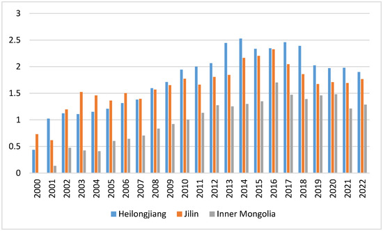 (1) The data on economic and social indicators are mainly derived from official data released by the National Bureau of Statistics and various statistical yearbooks, including the Heilongjiang Statistical Yearbook (2000–2022), the Jilin Statistical Yearbook (2000–2022) and the Inner Mongolia Statistical Yearbook (2000–2022). In addition, the tertiary indicators in the Comprehensive Indicator System for High-Quality Economic Development, such as the total amount of imports and exports, the amount of foreign direct investment, and the total number of books in public libraries (in thousands of books), are derived from the Cathay Pacific CASMAR database.