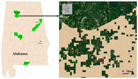 The location of the Bankhead National Forest in Alabama and the layout of study stands. (red line patches: early stage of longleaf pine forest; pink line patches: late stage of longleaf pine forest; white line patches: mature stage of longleaf pine forest; yellow-green line: mixed hardwood forest) (courtesy of Dr. Willian Sutton).