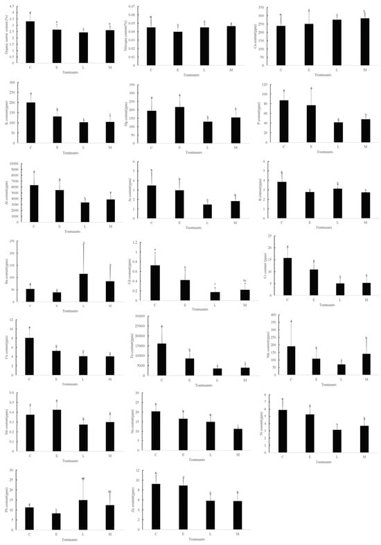 Comparison of the contents in soil organic matter, macro-nutrients, and trace metal elements at the mixed pine and hardwood forest and three stages of longleaf pine forest. (C: The old mixed pine and hardwood forest; E: the early stage of longleaf pine forest; L: the late stage of longleaf pine forest; M: the mature stage of longleaf pine forest. Different letters above error bars mean statistically different).