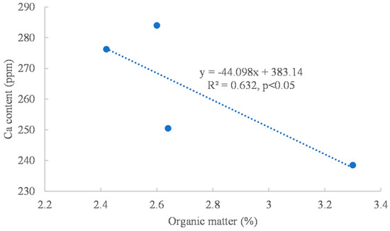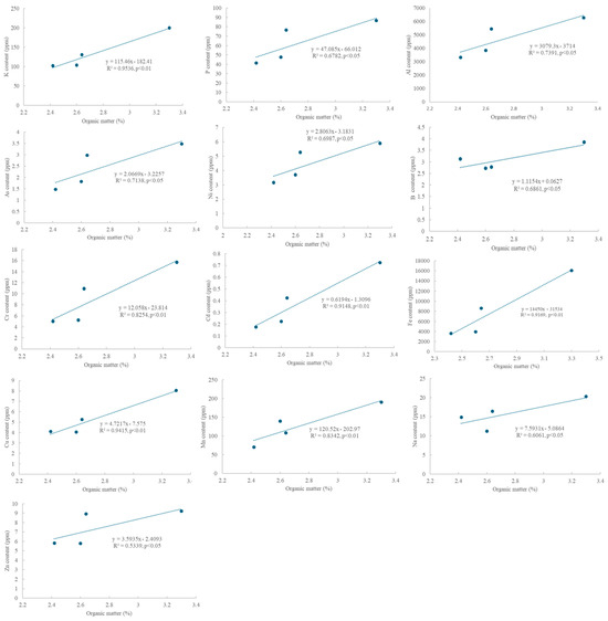 At the treatment level, the soil organic matter content was positively correlated with most soil metal elements (p < 0.05) (Figure 4), including K, P, Al, As, Ni, B, Cr, Cd, Fe, Cu, Mn, Na, and Zn. It was negatively correlated with soil Ca content (Figure 5). However, the soil organic matter content was not significantly correlated with that of soil N, Mo, Ba, and Pb (p > 0.05). The soil N content was significantly correlated with the soil Mg, Mo, and Pb (p < 0.05) (Table 2). However, it was not correlated with other metal elements (p > 0.05), including Ca, K, P, Al, As, B, Ba, Cd, Cr, Cu, Fe, Mn, Ni, and Zn. The soil Mn content was significantly correlated with Fe, K, P, Al, As, Cd, Cr, Cu, and Ni (p < 0.05) (Table 2), and it was not correlated with Ca, Mg, B, Ba, Mo, Na, Pb, and Zn. The soil Fe content was significantly correlated with that of more metal elements (p < 0.05), such as Ca, K, P, Al, As, B, Cd, Cr, Cu, Na, Ni, Mn, and Zn, and it was not correlated with that of Mg, Pb, Mo, and Ba (p > 0.05) (Table 2).
