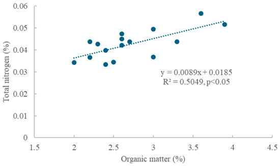 The correlation between soil organic matter and soil N contents across all soil samples.