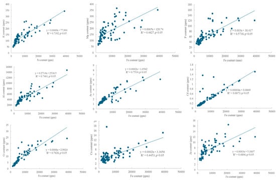 Across all soil samples, soil organic matter content was only significantly correlated with soil N content (p < 0.05) (Figure 6), and it was not correlated with the contents of other elements (p > 0.05). Soil N or Mn contents were not correlated with others. The soil Fe content was significantly correlated with the content of soil K, P, Al, As, Cu, Mg, Cd, Cr, and Zn, respectively (p < 0.05) (Figure 7).