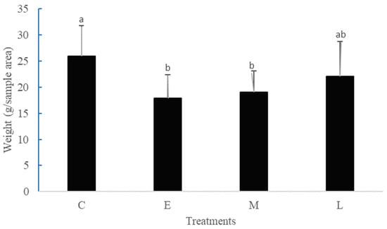 Comparison of litter production at the mixed pine and hardwood forest and three stages of longleaf pine forest (C: The old mixed pine and hardwood forest; E: the early stage of longleaf pine forest; L: the late stage of longleaf pine forest; M: the mature stage of longleaf pine forest. Different letters above error bars mean statistically different).