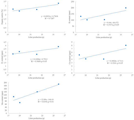 Correlation between litter production and the soil organic matter, K, B, Cu, and Mn contents on the treatment level.