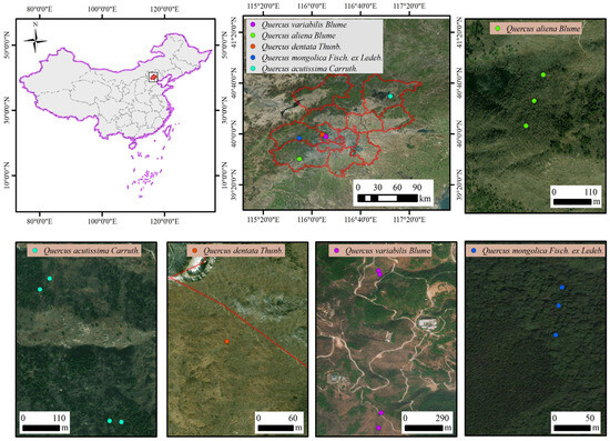 Location of survey plots for five Quercus species in Beijing: Q. aliena, Q. acutissima, Q. dentata, Q. variabilis, and Q. mongolica.