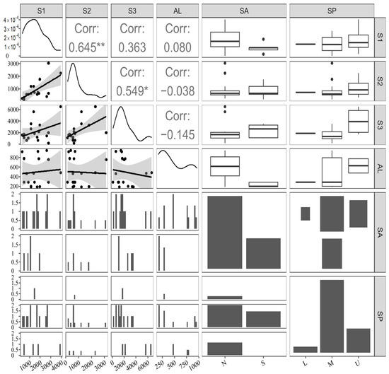 Pairwise relationship plots between natural regeneration density (Seedling 1 (S1), Seedling 2 (S2), and Seedling 3 (S3)) and three site factors. *: p < 0.05; **: p < 0.01; AL: altitude; SA: slope aspect; SP: slope position.