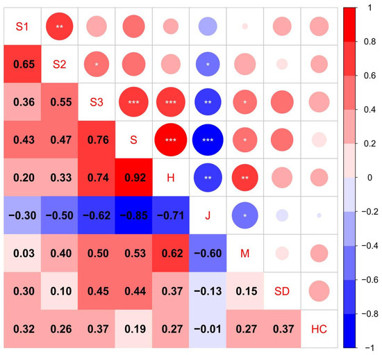 Heatmap of correlation coefficients between natural regeneration densities (Seedling 1 (S1), Seedling 2 (S2), and Seedling 3 (S3)) and stand factors. *: p < 0.05; **: p < 0.01; ***: p < 0.001; S: species richness; H: Shannon–Wiener index; J: Pielou evenness index; M: stand volume; SD: shrub density; HC: herbaceous coverage.