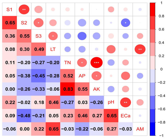 Heatmap of correlation coefficients between natural regeneration densities (Seedling 1 (S1), Seedling 2 (S2), and Seedling 3 (S3)) and soil factors. *: p < 0.05; **: p < 0.01; ***: p < 0.001; LT: litter layer thickness; TN: total nitrogen; AP: available phosphorus; AK: available potassium; pH: pH value; ECa: exchangeable calcium; AM: available manganese.