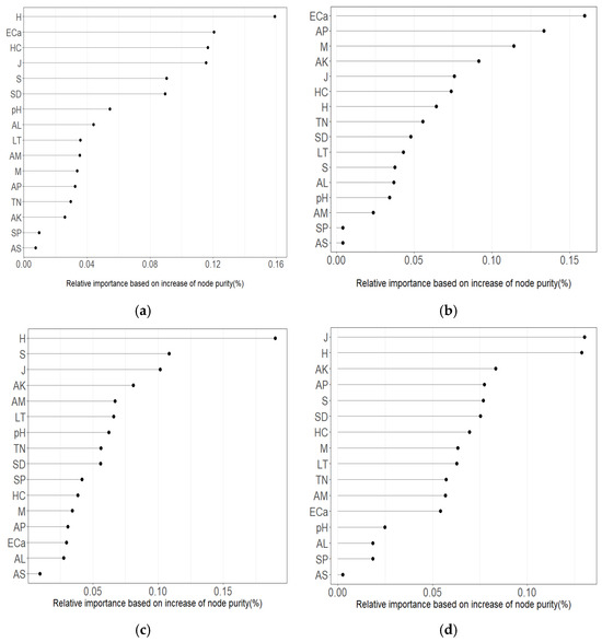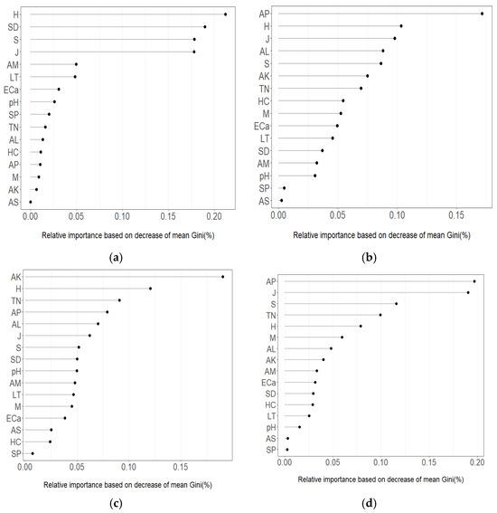 Using the random forest algorithm, the relative importance of the environmental factors affecting the natural regeneration grade (a categorical variable with three levels) in Quercus stands is ranked based on the Gini index reduction method, as shown in Figure 5. The top five important factors affecting S1 regeneration grade were H, SD, S, J, and AM, including four stand factors and one soil factor (Figure 5a). The top five important factors affecting S2 regeneration grade were AP, H, J, AL and S, including one site factor, three stand factors, and one soil factor (Figure 5b). The top five important factors affecting S3 regeneration grade were AK, H, TN, AP, and AL, including one site factor, one stand factor, and three soil factors (Figure 5c). The top five important factors affecting the regeneration grade of all seedlings (S1, S2, and S3) were AP, J, S, TN, and H, including three stand factors and two soil factors (Figure 5d). In summary, as the seedling growth stage progresses, the influence of site and soil factors on the regeneration grade increases.