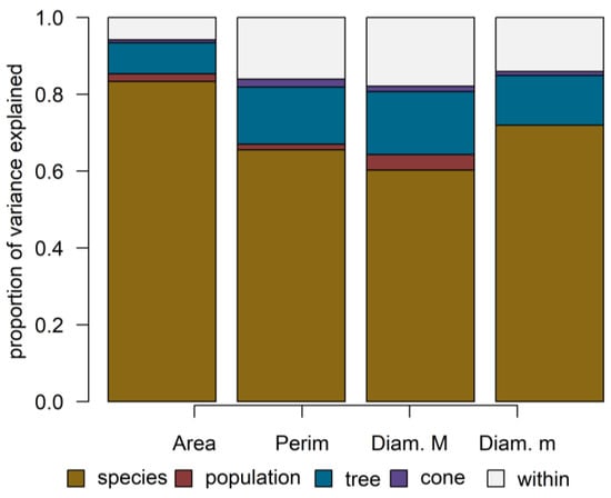 For all the measured variables of the cone scales (area, perimeter, maximum diameter, minimum diameter), it was found that the species explains the highest variance. The individual also exhibited a significant component of phenotypic plasticity for these variables, compared to the variability observed between populations or among cones, while the variance within each cone was also noticeable (Figure 4).