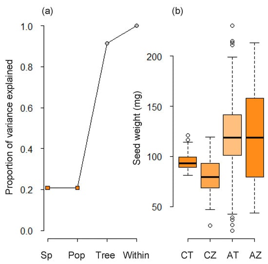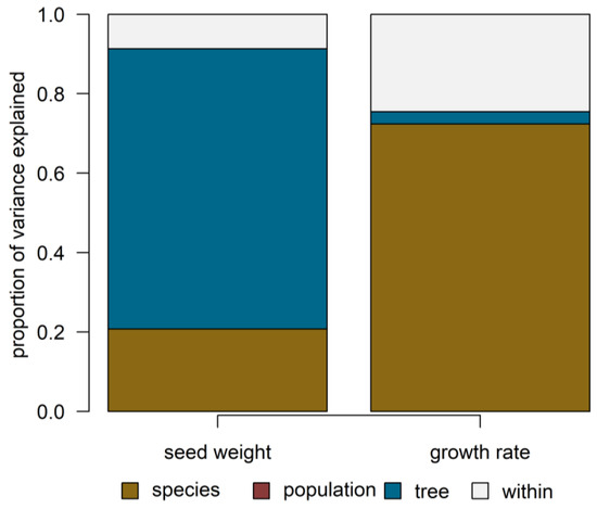 Regarding seed weight, the tree factor was highly significant (Supplementary Materials, Table S5), and it exhibits the highest variability. However, variability in growth rate was mainly determined by the species (Figure 5). The variability in seed weight was stronger within trees and among trees, compared to between populations (Figure 6a). The species only explained 20% of the variation, whereas the contribution of the population was irrelevant. Conversely, the tree factor accounted for about 70% of the variation.