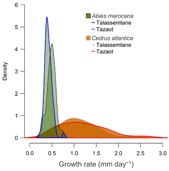 The field sampling was carried out in the Talassemtane National Park (see ref. [26] and references therein). The Moroccan fir (Abies marocana Trab.) is endemic to the calcareous western Rif Mountains, where it grows between 1400 and 2000 m a.s.l. We investigated the two main populations of A. marocana, located in the Tazaot range (35.25 N, −5.09 W, around 1760 m a.s.l.), covering about 300 ha, mostly on northern and northeastern slopes, and the Talassemtane range (35.14 N, −5.14 W, around 1730 m a.s.l.), covering about 3760 ha, on northern, northeastern, and northwestern slopes. The Talassemtane range has been referred as hosting the subspecies Abies pinsapo marocana (Trab.) Emb. & Maire, while the Tazaot range has been referred to as hosting the subspecies Abies pinsapo tazaotana (Cózar ex Villar) Govaerts [24]. Here we are not assuming genetic differences between both Moroccan fir populations [27,28,29]. The Atlas cedar (Cedrus atlantica (Endl.) Manetti ex Carrière) is endemic to north Morocco and Algeria. In the study area, C. atlantica grows generally above 1600 m, forming mixed forests with A. marocana [26].
