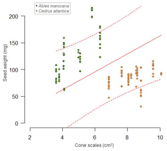 The model including cone scale area as a fixed effect was selected over the model including the cone scale area coefficient of variation based on AIC (AIC = 1718 and 1772, respectively). The two models were better than the intercept-only model (AIC = 1785.8). There was a positive relationship between cone scale area and seed weight (Figure 8). The effect of cone scale area on seed weight was significant (19.18 ± 2.03; t = 9.45; p < 0.05) as well as that of the coefficient of variation (−342.72 ± 84.18; t = −4.07; p <0.05). In the case of seedling growth rate, neither the cone scale area (0.01 ± 0.006; t = 1.89; p = 0.06) nor its coefficient of variation (0.32 ± 0.19; t = 1.66; p = 0.10) exerted significant influences. One could assume that, within each species, larger scales are related to seeds with greater weight (Figure 8). Overall, there is a positive relationship between cone scale area and seed weight which seems to be consistent between species and across populations.