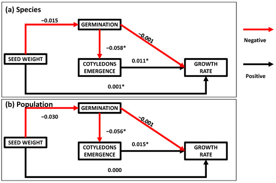Path coefficients according to the model proposed to explain the impact of seed weight and germination and cotyledons emergence time on growth rate for the two species (a) and four populations (b). Boxes represent measured variables and arrows (paths) represent direct positive (black) or negative (red) effects of the variables. Path coefficients, indicating the strength of the direct effect of one variable on another appear next to the arrows; * symbol indicates significant (p < 0.05) associated probability values.