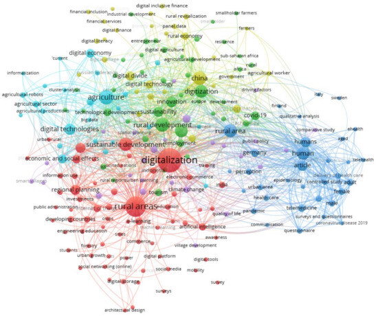 The analysis of the keywords connected to digitalization in rural territories showed 4470 results, while only 224 met the threshold of at least five co-occurrences. Observing the network of the keywords used in the studies about digitalization in rural areas, the results show four main clusters (dark blue, red, green, sky blue—Figure 2). The first (dark blue) cluster is composed by 33 keywords and includes studies conducted in Europe (e.g., Germany, Finland, Italy, Sweden) regarding citizens’ perceptions of new technologies and digitalization processes. The second (red) cluster is comprised of 67 keywords and focuses on the economic and social impacts of digitalization on sustainable development in rural areas. It is important to mention that in this cluster, there are studies focused on digitalization in the forestry sector (e.g., precision forestry). The third (sky blue) cluster focuses on agricultural digitalization to improve the production and allocation of products on the market. This cluster is composed of 25 keywords and includes the main studies on the digital economy, digital technologies, and the use of big data in agriculture. The fourth (yellow) cluster is composed of 44 keywords and mainly comprises studies on the role of smallholder farmers and agricultural workers in digital agricultural development. In addition, this cluster includes studies on digital (inclusive) finance and rural revitalization.
