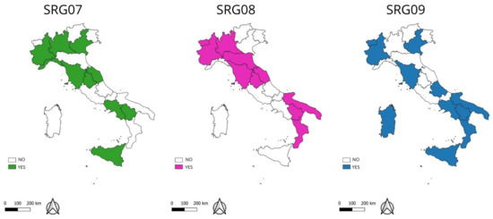 Distribution of the three SRGs examined across the national territory. Regions that have activated SRG07 are shown in green, those for SRG08 in purple, and those for SRG09 in blue.