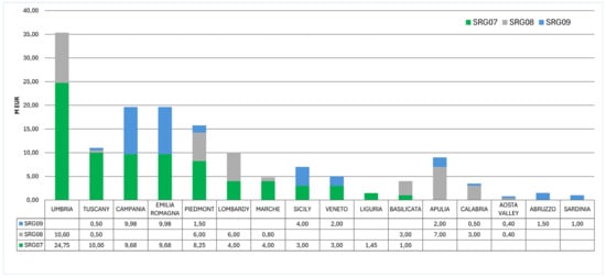 Figure 6 presents, in descending order, the funding activated by the regions for SRG07, SRG08, and SRG09, providing a direct answer to RQ3. The region with the highest active funding is Umbria, with EUR 10.60 million for SRG08 and EUR 24.75 for SRG09, followed by Tuscany, which has activated all three SRGs, with a total funding of EUR 11 million, and Campania, which has activated SRG09 with EUR 9.98 million and SRG07 with EUR 9.68 million.