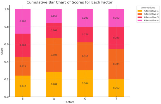 Cumulative bar chart of scores for each factor (strengths, weaknesses, opportunities, and threats) and for each alternative.