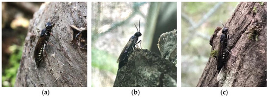 Fewer than females, one male X. eborata emerged from P. grayana. Six and thirteen males of X. ogasawarai emerged from C. japonica and A. sieboldianum, respectively, without much difference in the sex ratio between host tree species. These results suggest female-biased sex ratios, which are typical of Hymenoptera. Conversely, Siricidae exhibited a male-to-female ratio of 1–2:1, except for 0:1 Urocerus sah Mocsáry and 0.8:1 Urocerus fantoma Fabricius [6,40,41]. Those of S. noctilio and U. japonicus were 32:1 and 2–4:1, respectively, depending on their habitat and host tree status [40,42,43]. Female-biased sex ratios are often observed in insects that undergo local mating or inbreeding [44,45]. Generally, Hymenoptera reproduces through arrhenotokous or haplodiploidy, which is characterized by the development of unfertilized eggs into haploid male adults and fertilized eggs into diploid female adults [44,46]. These reproductive patterns are adaptively advantageous for minimizing the number of males as follows, assuming parasitoid wasps: (1) arrhenotokous female adults (foundresses) oviposit a cluster of eggs within the host; (2) the sex ratio is biased towards females, with at least one male present in the offspring group; (3) siblings develop together within the host, with male adults losing first; (4) male adults gain multiple mating opportunities, sequentially mating with later-emerging females; and (5) female adults, having stored sperm, disperse and search for new hosts. It is unclear whether Xiphydriidae has this ideal cycle, but we have shown that local oviposition and the early emergence of males fit it. Furthermore, in this study, X. annulitibia emerged only as females, and no males were found in previous studies, suggesting parthenogenesis [39]. Another possibility for the observed female-biased sex ratio of emerging adults in Xiphydriidae is that the mortality rate in eggs, larvae, pupae, and adults of males may be higher than that of females in the galleries of wood. Therefore, future research should be focused on obtaining the life table by counting the number of males and females during oviposition and following development, as well as ascertaining whether Xiphydriidae has a local mating system.