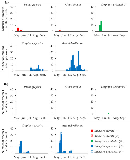 In 2024, only one adult (female) of X. annulitibia emerged on 24 June (Table 2). In contrast, X. ogasawarai emerged from late June to late September 2023 (Table 2 and Figure 2a) and from mid-May to early July 2024 (Table 2 and Figure 2b) in the first two consecutive years after tree felling. The sex ratio was female-biased in all the species: 10 females and one male in X. eborata, 251 females and 19 males in X. ogasawarai, and 28 females and no male in X. annulitibia (Table 2).