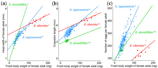 Overall, X. eborata exhibited the largest body size, X. annulitibia exhibited the smallest body size, and male adults were smaller than female adults (Table 1). There were significant positive correlations between fresh body weight and head width (Figure 3a) and between fresh body weight and ovipositor length (Figure 3b) in adult females of all species. The slope of the regression line between fresh body weight and head width for X. eborata was significantly smaller than that for the other species (Figure 3a). Additionally, for the regression between fresh body weight and ovipositor length, X. ogasawarai had the largest slope, with a significant difference between X. ogasawarai and X. eborata (Figure 3b).