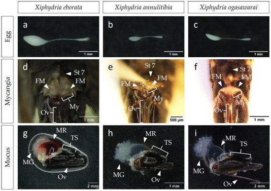 Comparative morphology of an egg (a–c), mycangia (d–f), and mucus (g–i) in three woodwasp species, Xiphydria eborata, Xiphydria annulitibia, and Xiphydria ogasawarai. St7: the 7th sternum; FM: fungal mass; My: mycangia; Ov: ovipositor; MR: mucus reservoir; MG: mucus grand; TS: terminal segment of the abdomen.