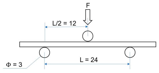 The determination of the modulus of rupture (MOR) and modulus of elasticity in bending (MOE) were provided according to ISO 13061-3:2014 [48] and ISO 13061-4:2014 [49], respectively. Standard wood samples (ST) were used. The MOR and MOE of yellow pine was carried out using an Instron® testing machine, model 3369 (Instron®, Norwood, MA, USA). The span length in the bending test for standard samples was 240 mm, the load speed was 5 mm × min−1. Twenty samples were used to determine the yellow pine wood properties.