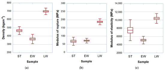 (a) Density, (b) modulus of rupture (MOR), (c) modulus of elasticity in bending (MOE) of yellow pine wood (ST—standard samples; EW—earlywood; LW—latewood).