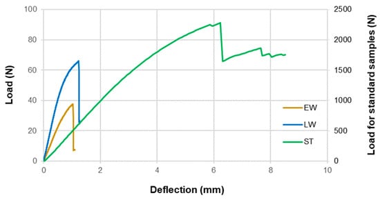 Load–deflection curves of yellow pine wood under bending test (EW—earlywood; LW—latewood; ST—standard samples).