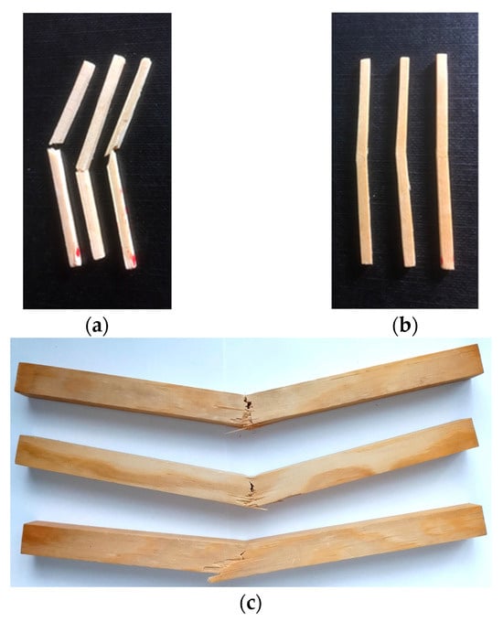 Load–deflection curves of yellow pine wood under bending test are presented in Figure 4. These curves are characteristic for wood when subjected to a three-point bending load [54,55,56]. The direction of the changes in the deflection was the same regardless of the wood zone and sample type (earlywood, latewood, standard samples). The differences were visible in the size of these changes, i.e., load and deflection values. The destructive force increases until the earlywood and latewood samples are destroyed. In the case of standard samples, the weakest zones of wood crack in the sample, which is visible in the figure as the local maxima. The load–deflection curves indicate that the failure mode of the latewood was ductile, and that of the earlywood was nearly brittle. This translated into different failure patterns and on the values of MOR and MOE. The samples of earlywood and latewood of yellow pine wood after bending test are presented in Figure 5. The failure type of the earlywood (Figure 5a) and latewood (Figure 5b) in the bending test with the span parallel to the grain can be described as splintering tension. The same type of failure is exhibited by the standard samples (Figure 5c).