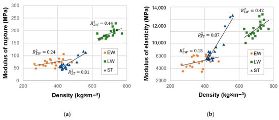 (a) The relationship between the density and modulus of rupture (MOR); (b) the relationship between the density and modulus of elasticity in bending (MOE) of yellow pine wood (EW—earlywood; LW—latewood; ST—standard samples).