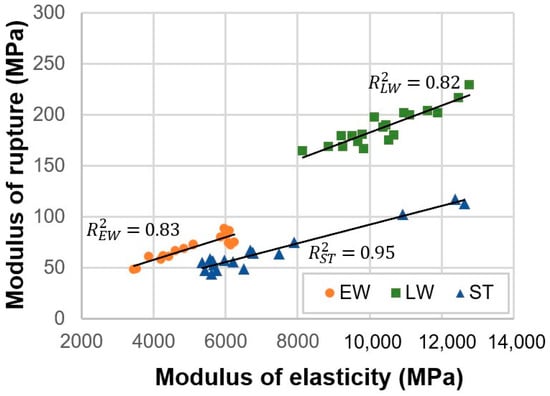 High R2 values were recorded for the relationship between the modulus of rupture (MOR) and modulus of elasticity in bending (MOE) of yellow pine wood (Figure 7). This confirms a strong dependence of MOR on the value of the yellow pine MOE regardless of the type of samples and wood zone. These relationships can be described by the equations: MOREW = 0.011 MOE + 13.531 for earlywood, MORLW = 0.013 MOE + 49.695 for latewood, and MORST = 0.009 MOE + 1.015 for the standard samples.