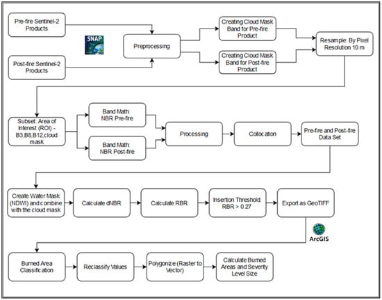 The mapping of the wildfires was carried out using two atmospherically corrected Sentinel-2 L2A satellite images for each fire, one captured before and another after the event. These images were processed using the SNAP v. 9 and ArcGIS v. 10.8 Desktop software. The methodology employed is divided into two distinct phases. The first phase, preprocessing, involves preparing the satellite images for analysis, ensuring they are suitable for subsequent steps. The second phase, main processing, encompasses the calculation of relevant indices and the application of necessary corrections, culminating in the extraction of data required for generating the final maps [47]. The flowchart in Figure 2 provides a detailed overview of the methodological steps.