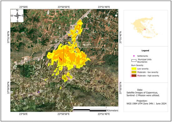 For each wildfire under study, two satellite images were collected; one captured before the fire (pre-fire) and another after the event (post-fire). These images were selected to be as temporally close to the fire events as possible, ensuring minimal cloud cover for optimal accuracy during processing. Specifically, the fire of the Avenue Varis-Koropiou was studied using a pre-fire image captured on 18 June 2024 and a post-fire image on 28 June 2024. Similarly, the Achaia-Ilia fire was studied using a pre-fire image dated from 16 June 2024 and a post-fire image from 26 June 2024. The Katsimidi wildfire in Parnitha was analyzed using a pre-fire image captured on 23 June 2024 and a post-fire image from 8 July 2024. Similarly, the Stamata wildfire was studied with a pre-fire image dated 26 June 2024 and a post-fire image from 8 July 2024. The details of the wildfire events and the Sentinel-2 images used for processing can be seen in Table 2.