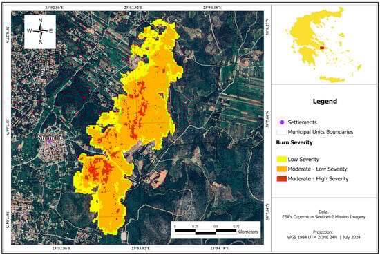 Similarly, the Stamata fire (Table 6) predominantly exhibited moderate to low burn severity, affecting 0.89 km2 or 63.12% of the burned area. Approximately 28.37% (0.40 km2) of the affected zone was classified as having low burn severity, while the remaining 8.51% (0.12 km2) fell into the moderate-to-high-severity category.
