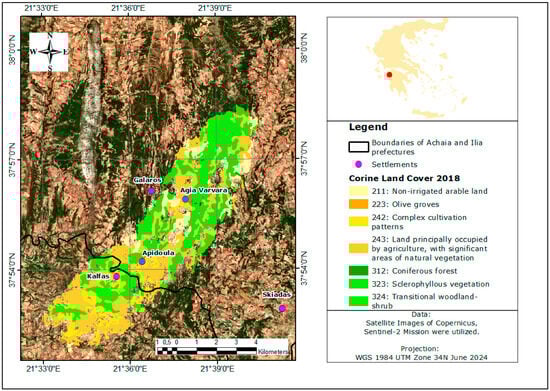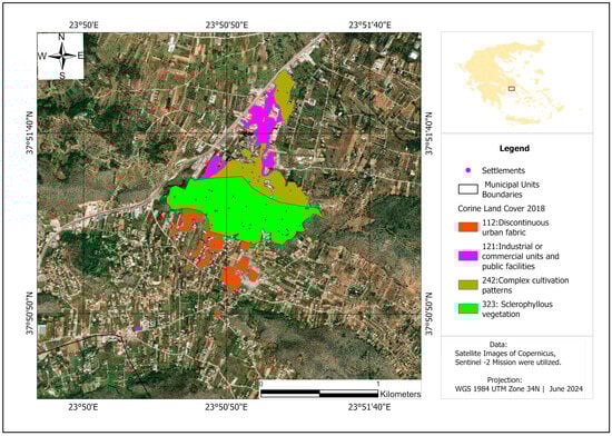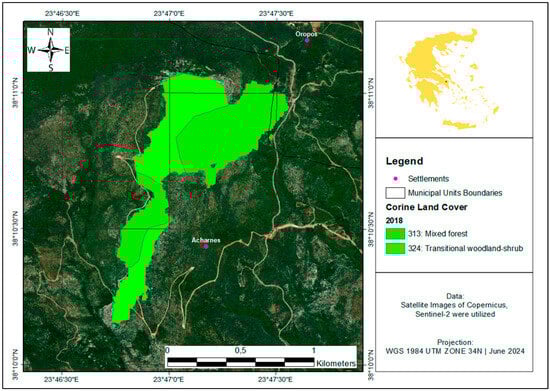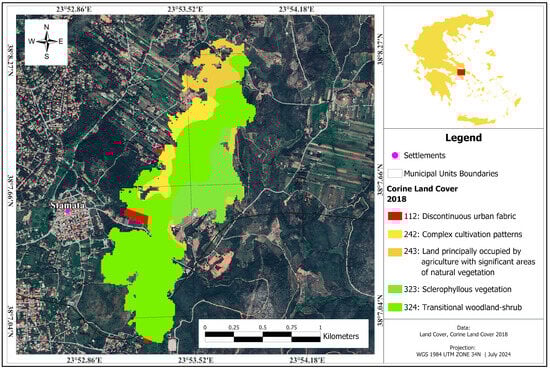 The land use and land cover information of the studied areas were obtained from CORINE Land Cover 2018 (CLC 2018) dataset, provided in vector polygon form (Table 1). This dataset was acquired from the Copernicus Land Monitoring Service platform of ESA [43]. The CLC 2018 data is publicly available and categorized into 44 primary land types. The dataset was utilized to identify the spatial distribution of land use within the burned areas, providing a high level of accuracy (≥85%) and cover a minimum area of 0.25 km2 (25 ha).