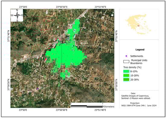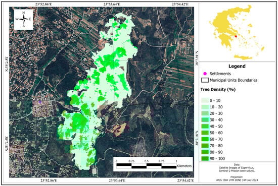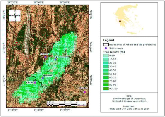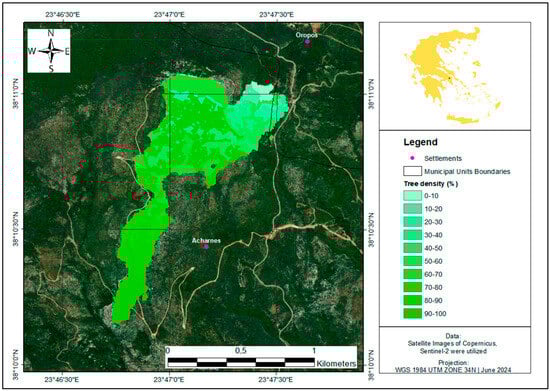 In this study, the Tree Cover Density (TCD) of the burnt areas was analysed using relevant data provided by the Copernicus program (Table 1). The TCD 2018 dataset quantifies tree cover density on a scale ranging from 0% (non-tree covered areas) to 100% (areas fully covered by trees). Similar to other dataset utilized in this research, the TCD 2018 data is openly accessible and provided by the ESA in raster format with a resolution of 10 m. cell size [44]. The accuracy of the TCD 2018 product has been internally validated before public release, ensuring its reliability. According to the TCD 2018 product user manual [45], the validation process is based on omission (user’s accuracy) and commission (producer’s accuracy) errors, with a target accuracy threshold above 90%. The metadata documentation for the 10 m dataset used in this study [46] reports an overall accuracy of 96.43% with a 95% confidence level, further reinforcing the robustness of this dataset for wildfire impact assessments.