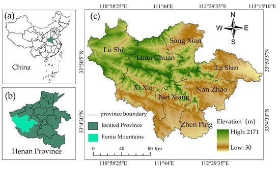 Geographical location of the study area: (a) Location of the study area in China. (b) Location in Henan Province. (c) Topographic map of the Funiu Mountains.