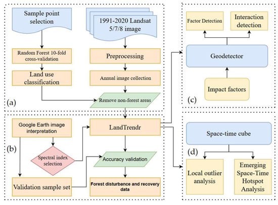 The methodological framework of this study consists of four main components (Figure 2): (a) data preprocessing and forest area extraction, (b) forest change detection using the LandTrendr algorithm, (c) spatiotemporal pattern analysis through space-time cube modeling, and (d) driving factor identification using the Geodetector method. The detailed procedures for each component are described in the following sections.