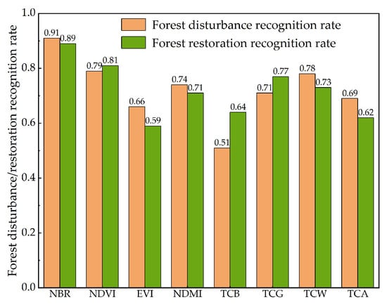 We used the LandTrendr Pixel Time Series Plotter user interface (https://emaprlab.users.earthengine.app/view/lt-gee-pixel-time-series, accessed on 18 December 2024) to compare the effectiveness of eight indices—NBR (Normalized Burn Ratio), NDVI (Normalized Difference Vegetation Index), EVI (Enhanced Vegetation Index), NDMI (Normalized Difference Moisture Index), TCB (Total Canopy Brightness), TCG (Total Canopy Greenness), TCW (Total Canopy Wetness), and TCA (Total Canopy Absorption)—in identifying forest disturbance and recovery at the same location. Ground truth validation was performed using historical Google Earth imagery to verify the occurrence of disturbance and recovery events and quantify the detection accuracy of each spectral index. We calculated the ratio of the number of instances correctly identified by each index to the actual number of disturbance and recovery events and derived the detection rate of each spectral index for forest disturbance and recovery in the Funiu Mountains region. The results (Figure 3) indicate that NBR has the highest sensitivity in monitoring disturbance and recovery, so we chose NBR to run the LandTrendr algorithm. Based on forest areas identified as disturbed, recovered, or stable at different times, a sample set for the subsequent accuracy validation was constructed.
