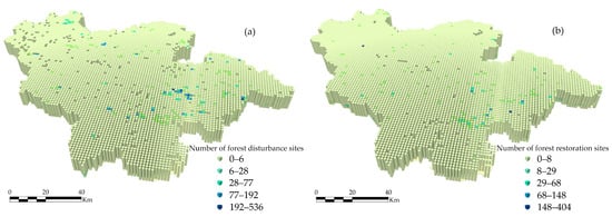 Based on previous parameter optimization, we applied a 4500-m domain distance and 6-year domain time step to detect hot- and cold spot patterns. Figure 8 presents the results, with forest disturbance patterns in Figure 8a and recovery patterns in Figure 8b.