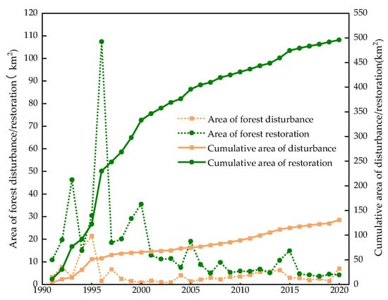 From 1991 to 2020, the area of forest disturbance reached 131.19 km2, accounting for approximately 1.2% of the total forest area (11,312 km2). The area of forest recovery was 495.88 km2, representing 4.4% of the forest land regeneration (Figure 5). Forest disturbance and recovery were most active during the 1990s, with the peak disturbance occurring in 1995 (21.54 km2, 16.3% of the total disturbance) and maximum recovery in 1996 (107.46 km2, 21.6% of the total recovery).