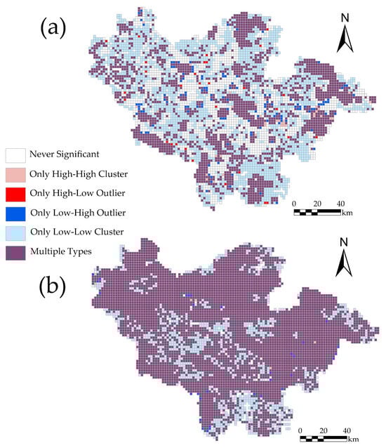 The “Low-High Outlier” pattern occurred sporadically throughout the study area, except in the northwest, representing stable or protected forest ecosystems surrounded by high-disturbance zones. These areas, often adjacent to “Only High-High Clusters”, face potential edge effects that may compromise their long-term ecological stability. The “Only Low-Low Cluster” and “Multi-type” patterns were the most prevalent, accounting for 36.2% and 36.6% of the grid points, respectively (Figure 7). “Only Low-Low Clusters” typically occurred in areas with stable environmental conditions and minimal human interference, while Multi-type patterns indicated temporal variation in the clustering characteristics.
