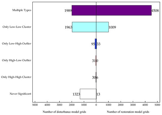 Forest recovery exhibited distinct spatial characteristics, with Multi-type patterns dominating (80.9% of the grid points) and “Only Low-Low Clusters” accounting for only 18.1%. This distribution suggests greater spatiotemporal complexity and sensitivity to multiple influencing factors compared to disturbance patterns. “Only High-Low Outliers” were absent, and only six High-High cluster points were identified in the northwest and southeast, potentially indicating areas where natural or anthropogenic factors inhibit recovery despite favorable surrounding conditions.