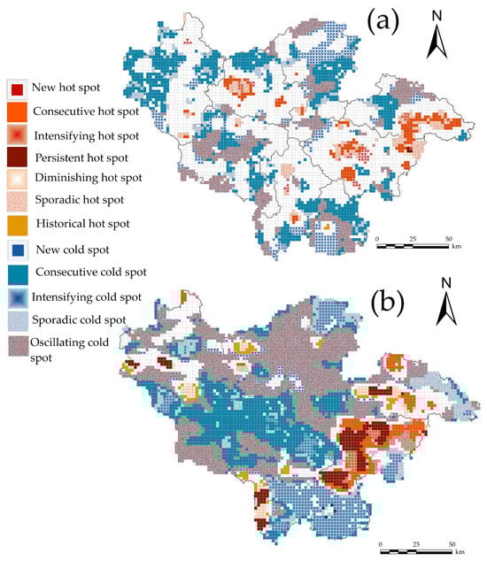 3.3.2. Spatiotemporal Hot and Cold Spot Patterns