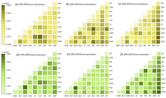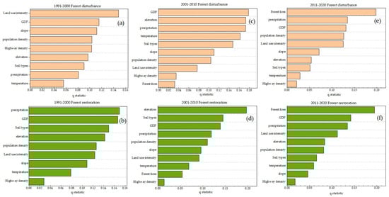 Factor detection for different periods: (a, c, e) are the factor detections for forest disturbance, while (b, d, f) are the factor detections for forest recovery.