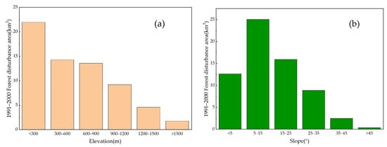 Distribution of forest disturbance at different elevations (a) and slopes (b) from 1991 to 2000.