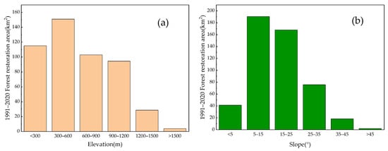 Distribution of forest recovery at different elevations (a) and slopes (b) from 1991 to 2020.